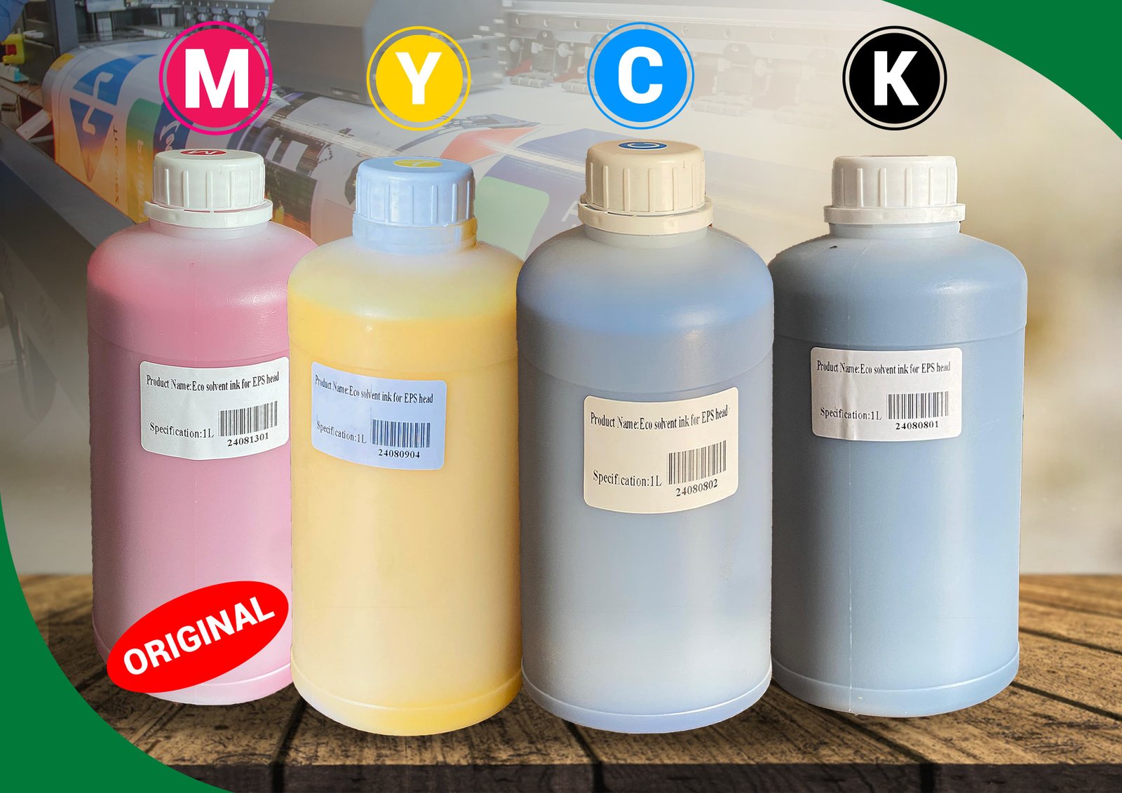Une gamme complète d'encres (solvant, Ecco-Solvant Ink, Aqueuse) et cartouches de haute qualité pour imprimantes professionnelles, garantissant des couleurs vives et durables.